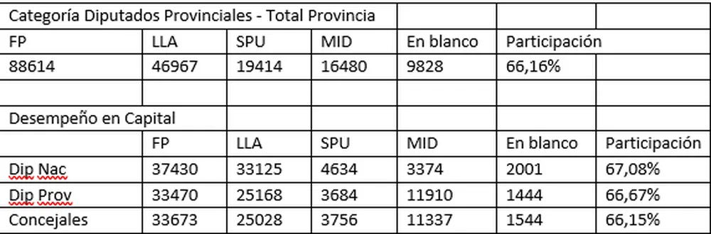Si se calcula la incidencia del voto capitalino en la elección provincial, Fuerza Patria logró en la Capital el 37,77% de sus votos, La Libertad Avanza el 53,58%, Somos Provincias Unidas el 18,97% y el MID el 72,26%. Con eso, se puede asegurar que Javier Galán se convirtió en diputado gracias al voto en la Capital, mientras que SPU (UCR) logró dos bancas gracias al respaldo de los votos en el interior.