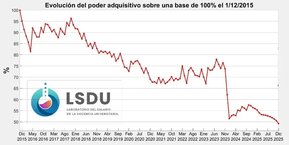 “Estos datos no son sólo números, sino el reflejo de una década de erosión salarial que impacta directamente en la dignidad laboral y la sustentabilidad del sistema universitario” señaló un documento elaborado por el Laboratorio del Salario de la Docencia Universitaria (LSDU) que analizó también el deterioro del poder acumulado durante los últimos tres mandatos presidenciales.