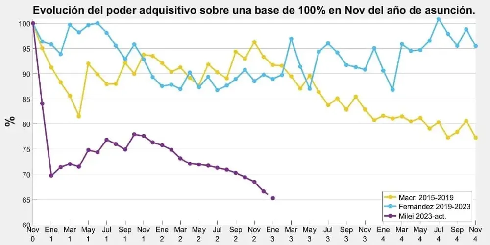 Sobre la evolución puntual en la actual administración libertaria puntualizaron que “durante los primeros dos meses del gobierno de La Libertad Avanza (LLA) el poder adquisitivo del salario sufrió un desplome significativamente mayor que el registrado en las dos administraciones anteriores. La recomposición salarial posterior —entre febrero y octubre de 2024— fue lenta y discontinua, recuperando apenas 7 puntos en 9 meses. Esa recuperación parcial se interrumpió luego con una nueva caída, que perforó nuevamente el mínimo alcanzado al inicio del mandato”, detalló el documento al que accedió este medio.