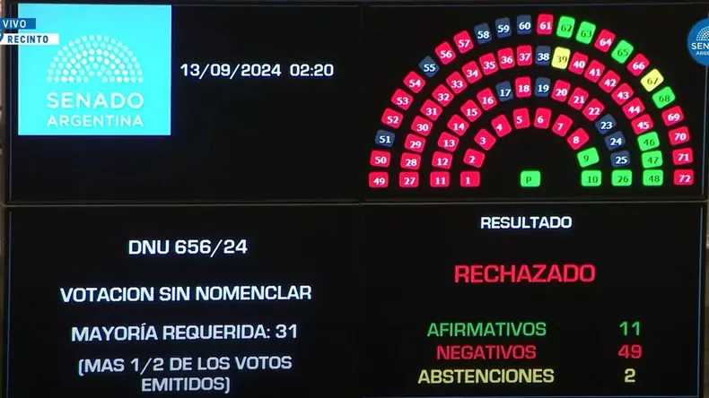 El rechazo, que se produjo pasadas las 02:15 del viernes, fue 49 votos frente a 11 positivos para mantenerlo vigente y dos abstenciones. Fue la primera vez que el Congreso rechaza un DNU.