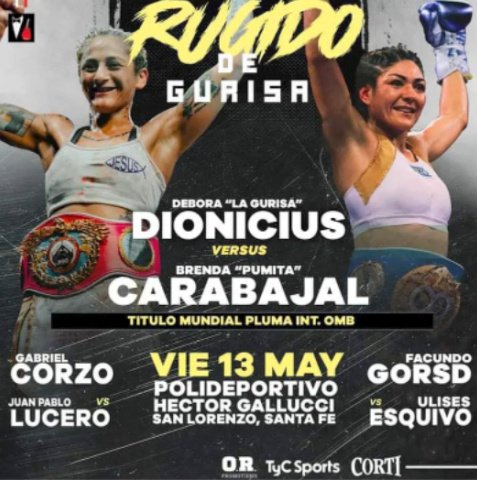Como pelea estelar, la actual campeona mundial interina Pluma OMB, la entrerriana Débora «La Gurisa» Dionicius (32-3 con 6 Ko) defenderá el cetro que consiguió en el estadio Luna Park (Buenos Aires). Su rival será la ex campeona mundial Pluma FIB, la jujeña Brenda «La Pumita» Carabajal (17-5-1 con 9 Ko).