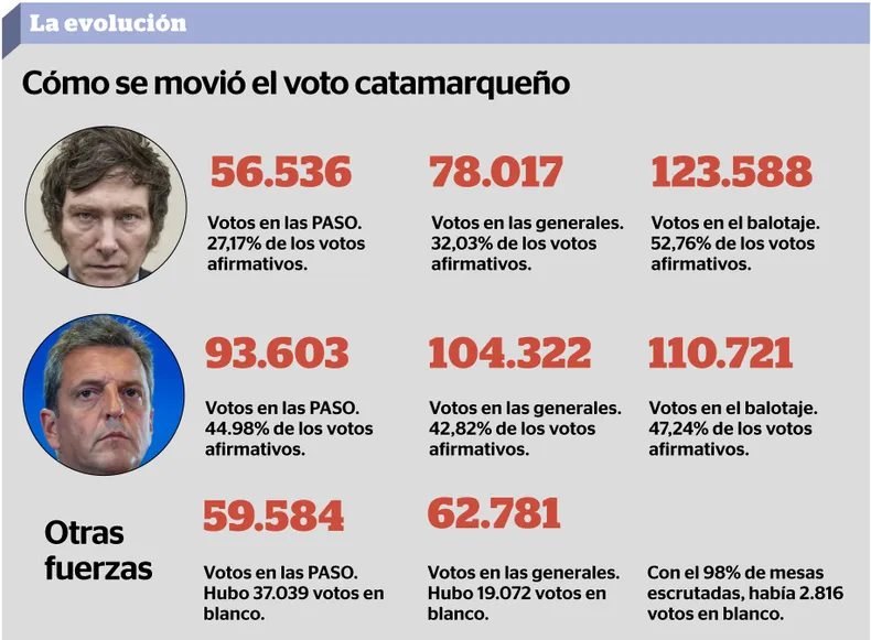 En octubre, hubo 62.781 votos que se repartieron entre Patricia Bullrich (JPC), Juan Schiaretti (Hacemos) y Myriam Bregman (FITU), a los que se sumaron otros 19.072 votos en blancos. Es decir que Milei y Massa se disputaron las adhesiones de casi 82.000 catamarqueños que fueron a las urnas el mes pasado y no habían optado por ninguno de los dos.