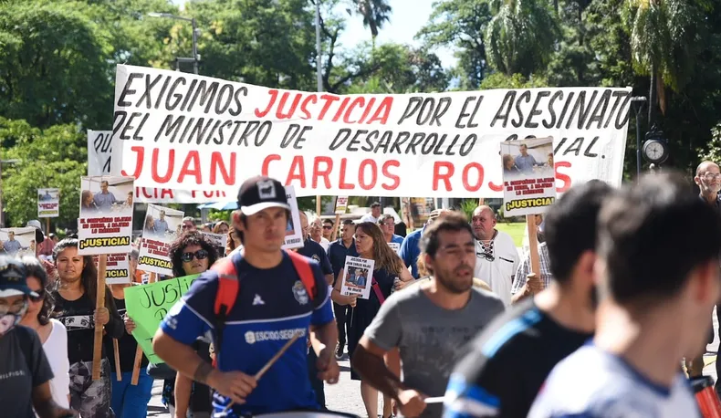 Con una gran concurrencia se llevó a cabo ayer a la mañana la marcha al cumplirse los tres meses del crimen del ministro de Desarrollo Social, Juan Carlos Rojas. La familia se unió en un abrazo, emocionada, al culminar la manifestación en el edificio de Fiscalía Penal.