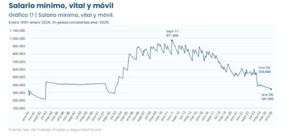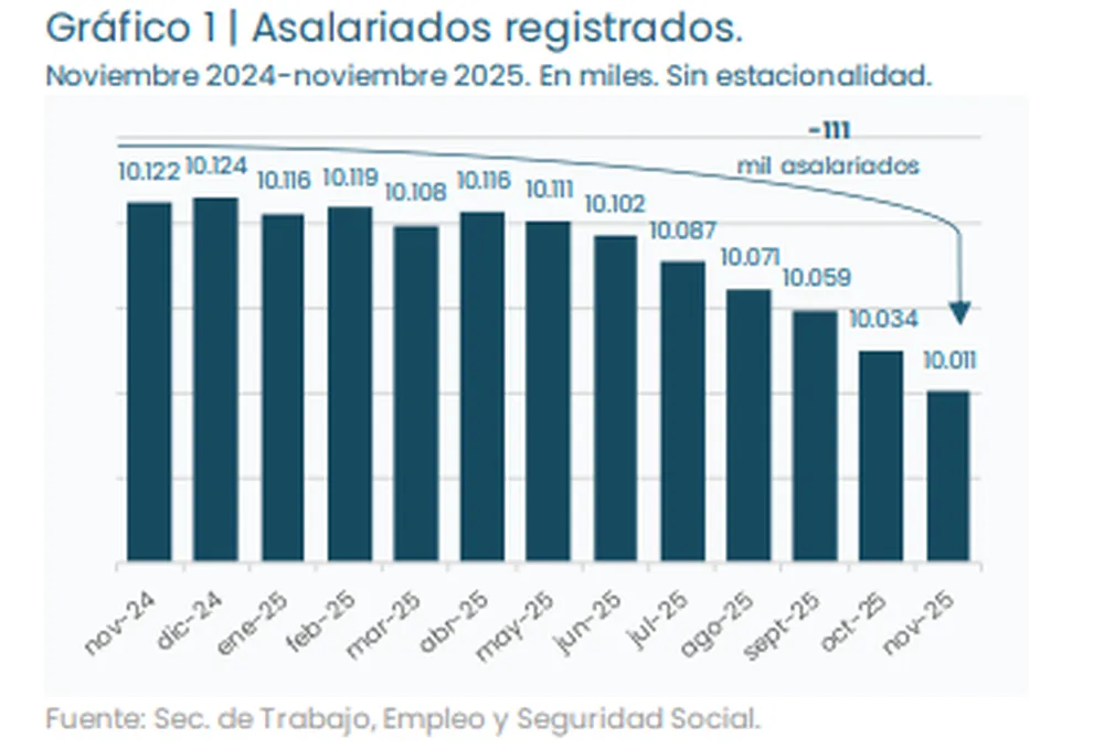 Más datos: desde mayo a noviembre de 2025, se registraron siete meses de caídas consecutivas del empleo. El salario también perdió poder de compra.