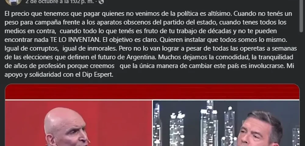 «Muchos dejamos la comodidad, la tranquilidad de años de profesión porque creemos que la única manera de cambiar este país es involucrarse. Mi apoyo y solidaridad con el diputado Espert», finalizó Brizuela.