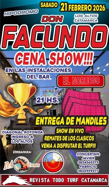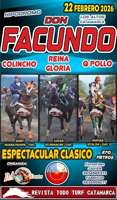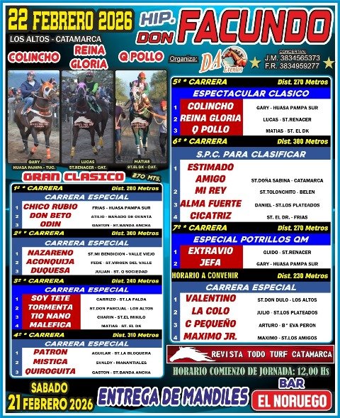 Este domingo 22, el Hípico «Don Facundo» ubicado en la localidad de Los Altos (Dpto. Santa Rosa), prepara una reunión con ocho carreras cuadreras de primer nivel. La primera del programa se correrá a las 14 hs y entre las concertadas habrá varias especiales y un sensacional clásico interprovincial.