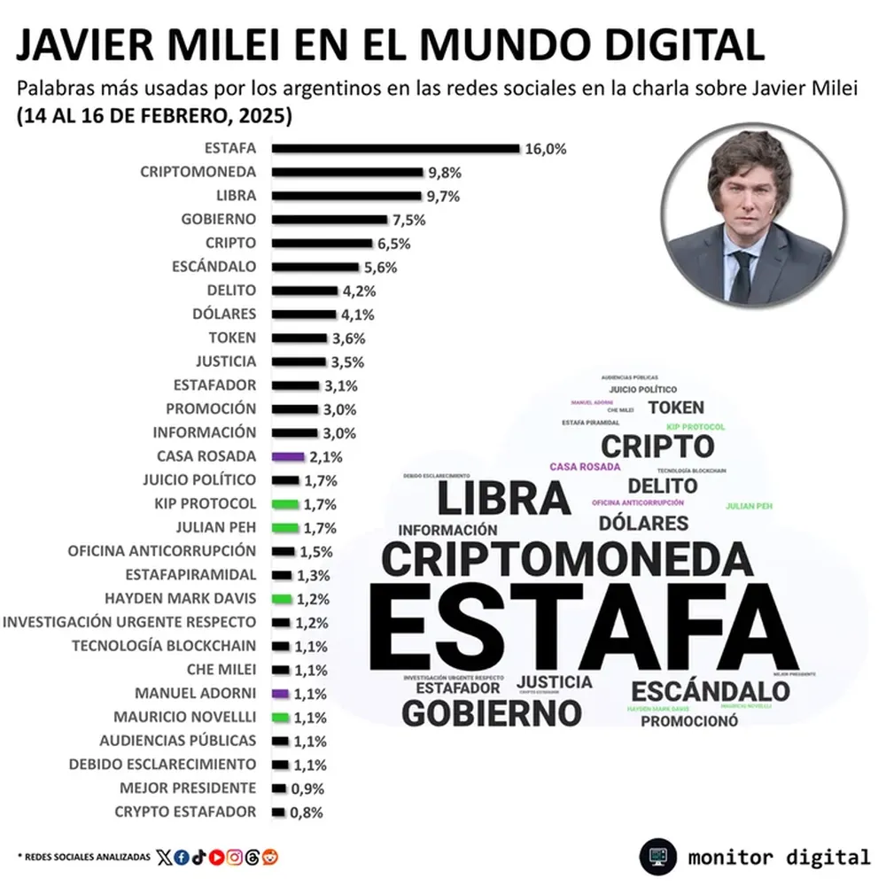 El presidente Javier Milei enfrenta una crisis política y de credibilidad tras la promoción en redes sociales de la criptomoneda $LIBRA, un activo desconocido para el público general y cuestionado por la comunidad cripto. Según un estudio de Monitor Digital, el escándalo de la criptoestafa potenció la negatividad en la conversación digital y consolidó «estafa» como la principal palabra clave utilizada en redes sociales para atacar su figura.