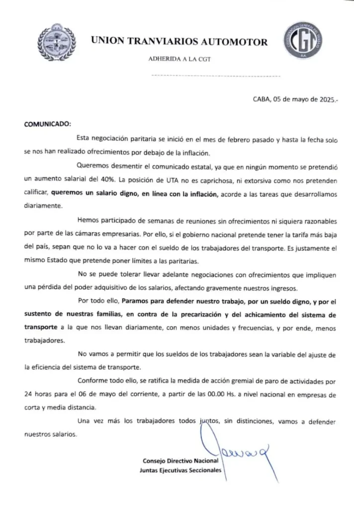 La UTA reclama una mejora salarial ante la falta de acuerdo con las cámaras empresarias del sector. Las cámaras del transporte (FATAP, AAETA, CEAP, CETUBA, CTPBA y CEUTUPBA) ofrecieron tres sumas no remunerativas: $40.000 a pagarse el 26 de mayo, $50.000 el 16 de junio y $70.000 el 15 de julio. La UTA rechazó esa oferta por considerarla insuficiente. Desde el sindicato piden por un sueldo básico de $1.700.000.