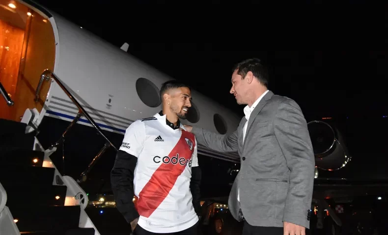 Lanzini fue recibido por el presidente del club, Jorge Brito, tras aterrizar en el aeropuerto de Ezeiza, donde rápidamente se puso la camiseta de River.