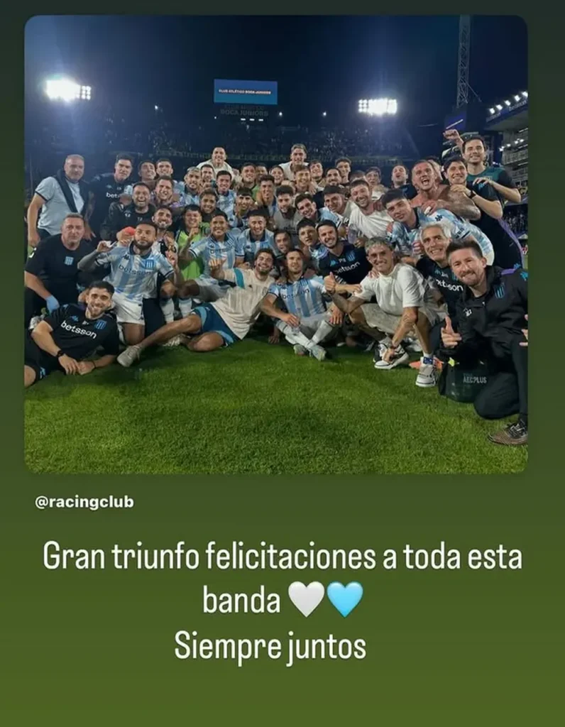 Una vez consumado la victoria de la Academia, sin el ingreso de Rojo desde el banco de suplentes, el defensor recurrió a las redes sociales para celebrar el pase a la final. «Gran triunfo felicitaciones a toda esta banda. Siempre juntos», escribió en una historia de Instagram junto a una foto del equipo en La Bombonera.