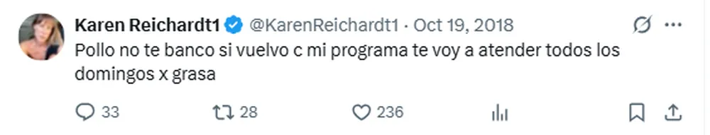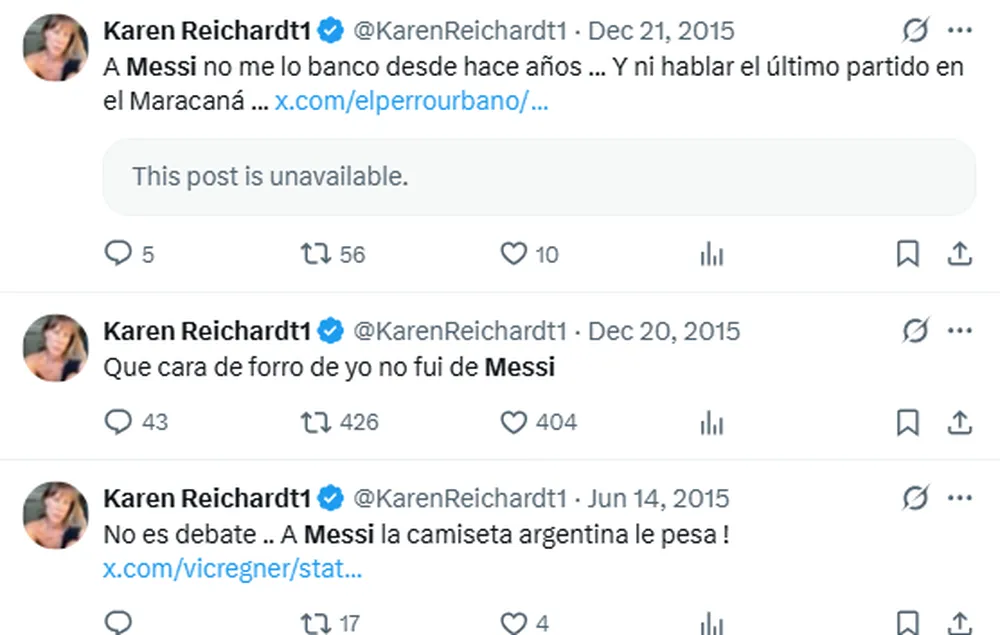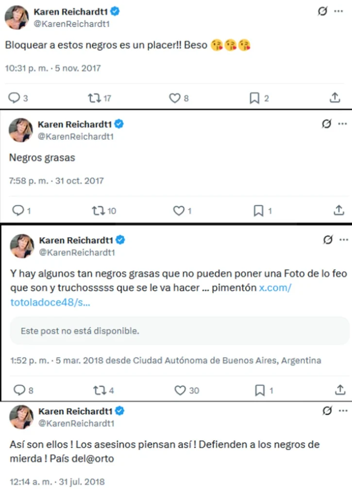 Reichardt también dedicó insultos a Lionel Messi, a quien trató de “cagón”, “forro” y “puto”, en una muestra del desprecio con el que se expresa hacia símbolos populares. La agresión se extiende incluso a interacciones triviales: desde insultar a usuarios anónimos hasta ironizar con imágenes racistas bajo el pretexto de “humor negro”.