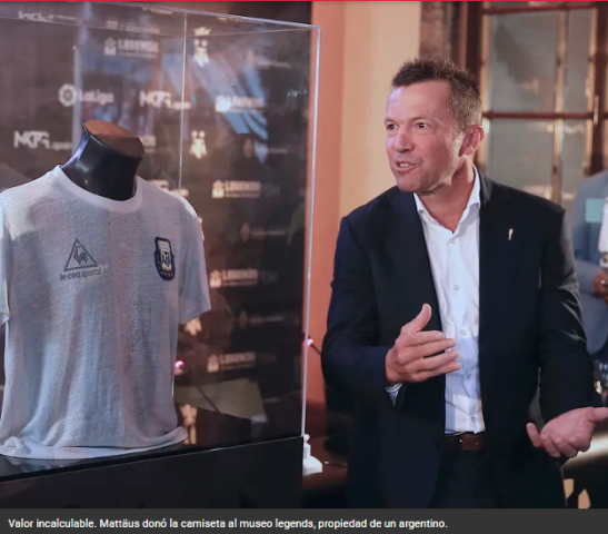 El exfutbolista alemán Lothar Matthäus donó ayer a Legends, la mayor colección de reliquias del fútbol internacional, la camiseta que Diego Armando Maradona usó ante Alemania en la final del Mundial de México 1986 y luego de ser exhibida en Madrid, volverá a la Argentina en las próximas semanas.