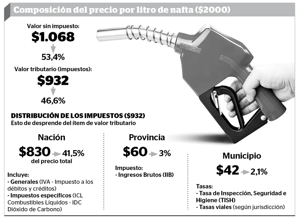 De los $2.000 que ronda el litro de nafta, unos $932 corresponden a impuestos y, de ese total, alrededor de $830 quedan en manos de la Nación a través del IVA, el impuesto a los débitos y créditos y los gravámenes específicos sobre los combustibles.