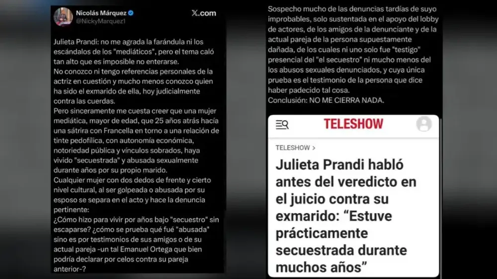 El biógrafo del presidente Javier Milei, Nicolás Márquez, cuestionó abiertamente a Julieta Prandi y puso en duda sus dichos, luego de que su ex marido, Claudio Contardi, fuera condenado a 19 años de prisión por abuso sexual agravado. El escritor comenzó su extenso posteo, mediante su cuenta de X (ex Twitter): “No conozco ni tengo referencias personales de la actriz en cuestión y mucho menos conozco quien ha sido el exmarido de ella, hoy judicialmente contra las cuerdas”.
