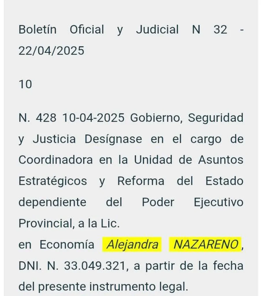 Este martes se firmó el boletín oficial donde Alejandra Nazareno fue nombrada como Coordinadora de la Unidad de Asuntos Estratégicos y Reforma del Estado del Poder Ejecutivo Provincial, y lo hace en reemplazo de Fernando Ávila, que había asumido ese lugar al dejar el Ministerio de Gobierno. Hasta ahora se desconoce si Ávila asumirá algún otro rol dentro del Gobierno.