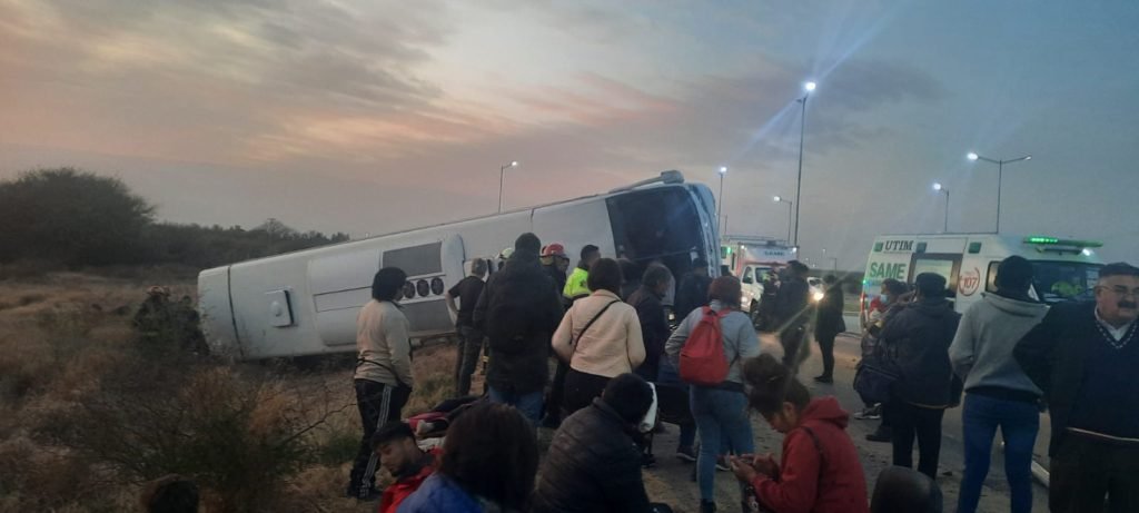 Un colectivo de la empresa 25 de Agosto volcó en la rotonda de ingreso al Mercado de Abasto.