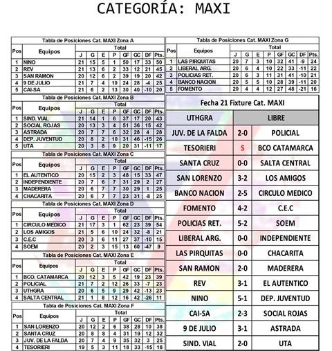 UTHGRA LIBRE, JUV.DE LA FALDA 2-0 POLICIAL, TESORIERI (S) BCO CATAMARCA, SANTA CRUZ 0-0 SALTA CENTRAL, SAN LORENZO 3-2 LOS AMIGOS, BANCO NACION 2-5 CIRCULO MEDICO, FOMENTO 4-2 C.E.C, POLICIAS RET. 5-2 SOEM. LIBERAL ARG. 0-0 INDEPENDIENTE, LAS PIRQUITAS 0-0 CHACARITA, SAN RAMON 2-0 MADERERA, REV 3-1 EL AUTENTICO, NINO 5-1 DEP. JUVENTUD, CAI-SA 2-3 SOCIAL ROJAS, 9 DE JULIO 3-1 ASTRADA, SIND. VIAL 2-0 UTA.