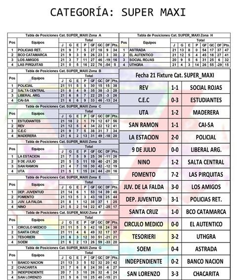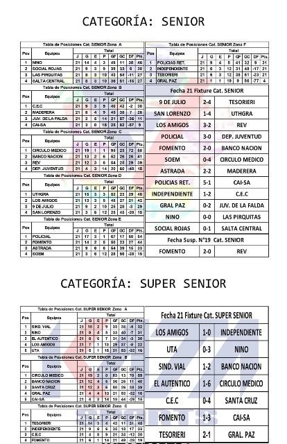 REV 1-1 SOCIAL ROJAS, C.E.C 0-3 ESTUDIANTES, UTA 1-2 MADERERA, SAN RAMON 1-1 CAI-SA, LA ESTACIÓN 2-0 POLICIAL, 9 DE JULIO 0-0 LIBERAL ARG., NINO 1-2 SALTA CENTRAL, FOMENTO 7-2 LAS PIRQUITAS, JUV. DE LA FALDA 3-0 LOS AMIGOS, DEP. JUVENTUD 3-1 POLICIAS RET., SANTA CRUZ 1-0 BCO CATAMARCACIRCULO MEDICO 0-0 EL AUTENTICO, TESORIERI 3-2 UTHGRA.