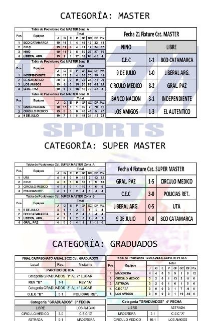 GRAL. PAZ 1-5 CIRCULO MEDICO, C.E.C 3-0 POLICIAS RET., LIBERAL ARG. 0-5 UTA, 9 DE JULIO 0-0 BCO CATAMARCA.