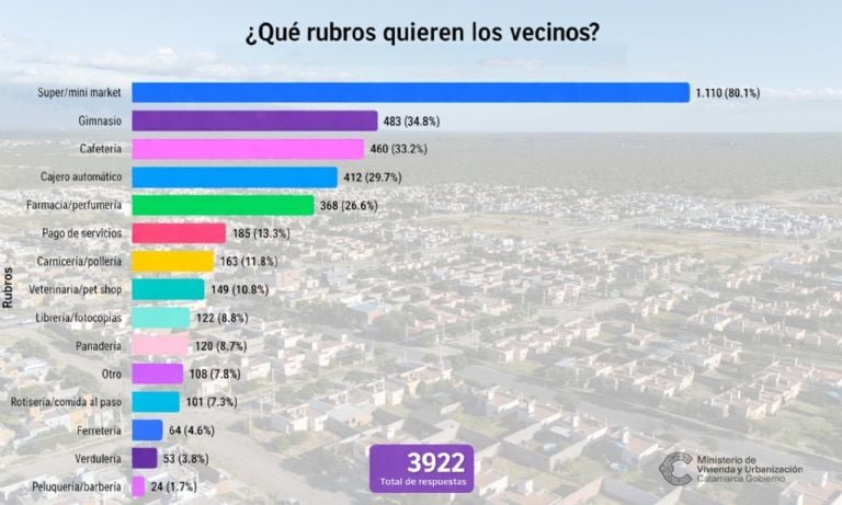 La iniciativa permitió relevar las principales demandas de la comunidad respecto a los rubros comerciales y servicios que consideran necesarios para su vida cotidiana. En total, se registraron 3.922 respuestas, reflejando un alto nivel de participación e interés por parte de los vecinos.