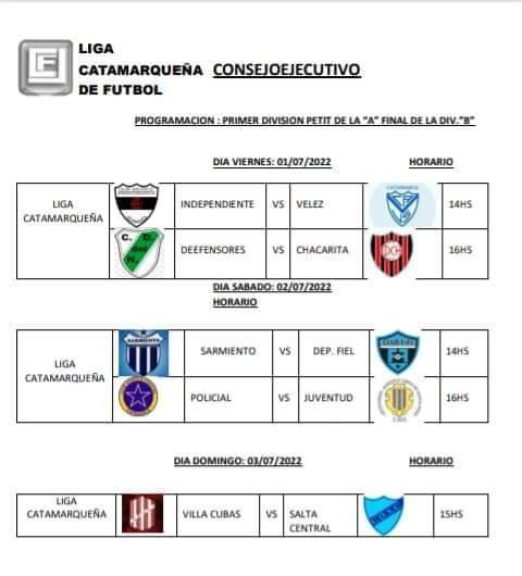 Se programó el petit 28 junio, 2022 Actualidad, Deportes, Información General, Provinciales Se aprobó la programación del petit torneo de ambas categorías en la liga catamarqueña para los días viernes, sábado y domingo en el siguiente orden. Para compartir: