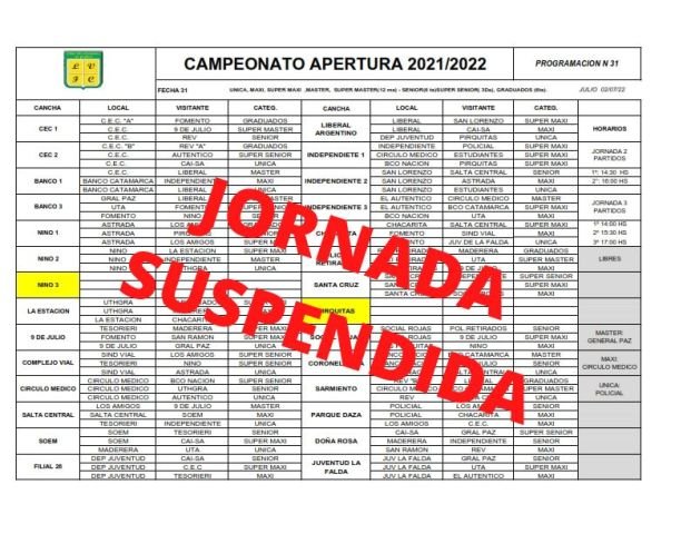 La 31ª fecha del Torneo Anual 2021/2022 de la Liga de Veteranos de Fútbol se suspende, según se pudo conocer, la determinación de la organización obedece a la falta de árbitros.