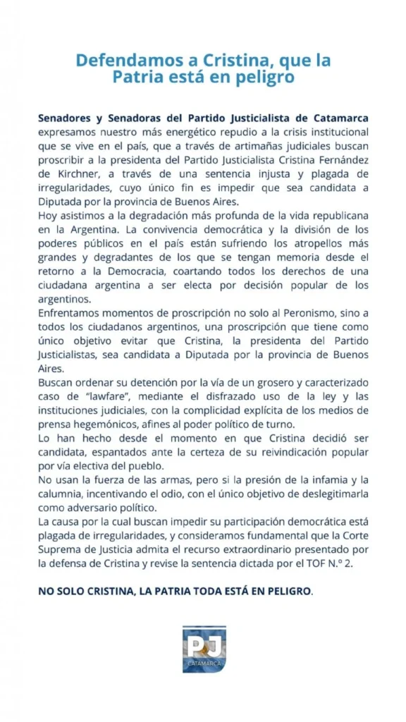 Los senadores y senadoras del Partido Justicialista de Catamarca expresaron su más enérgico repudio ante la crisis institucional que atraviesa Argentina, calificando como una maniobra judicial que busca proscribir a Cristina Fernández de Kirchner. En un comunicado, indicaron que la sentencia, cargada de irregularidades, tiene como único objetivo impedir que la expresidenta sea candidata a Diputada por la provincia de Buenos Aires.