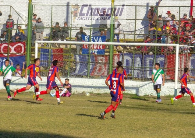 El primer gol llegó a los 21m tras una pifia de José Romero que dejó el balón servido en el corazón del área al pibe Franco Chasampi que no perdonó.