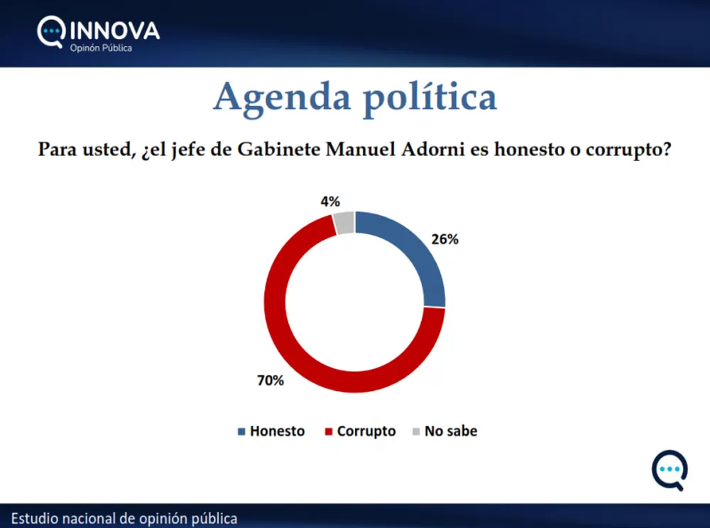 El escándalo patrimonial en el que Manuel Adorni sumió al gobierno pegó en la línea de flotación del relato de la Casa Rosada. La consultora Innova elaboró un informe en el que refleja que el 70 por ciento de los encuestados cree que el jefe de Gabinete libertario es corrupto.