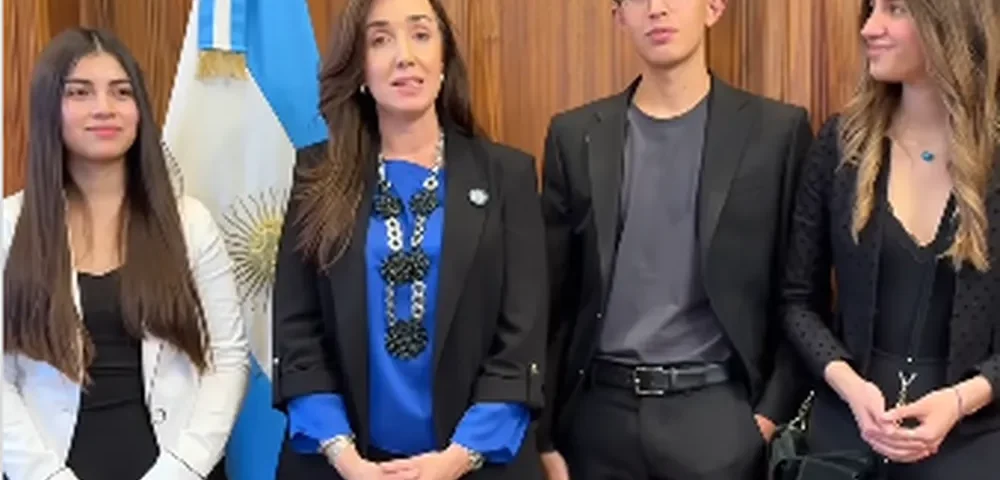 La vicepresidente Victoria Villarruel recibió a los tres jóvenes de Belén, Catamarca, que representarán al país en la Semana Mundial del Agua 2025, que se desarrollará del 23 al 28 de agosto, en Suecia. Paula Bazán, Martina Cecenarro y Leopoldo Gómez competirán por el Premio Nobel Junior del Agua, con su proyecto «Sistema Circular de Reutilización y Purificación del Agua», que busca dar una solución sostenible al uso del agua.